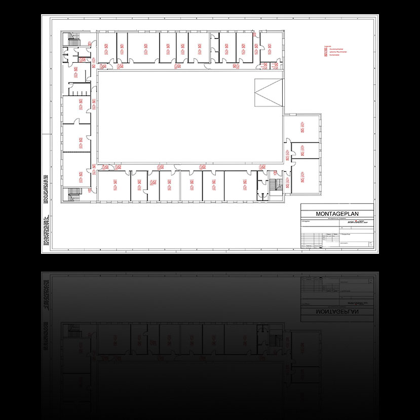Montage- und Bestandspläne werden nach Kundenwunsch und Vorlagen erstellt. Für die Geschosspläne können die Feuerwehr-Laufkarten als Vorlage dienen. Das Schema kann z.B. nach Versorgungsplänen der Brandmelderzentrale erstellt werden. Die fertigen Pläne können dann als Datei oder Plot zur Verfügung gestellt werden.