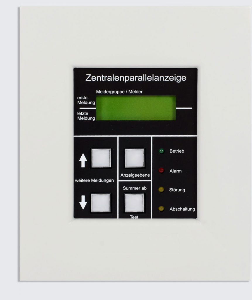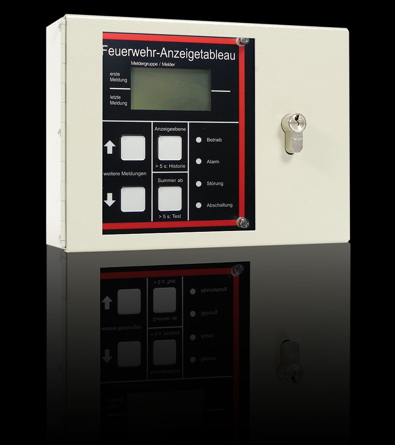 Feuerwehranzeigetableau nach DIN 14662. Grafikdisplay oder Klartextanzeige mit 4 Zeilen je 20 Zeichen für die älteren Baureihen. Universelle Anschlussmöglichkeiten TTY, RS232, RS422, RS485, mit oder ohne redundanten Übertragungsweg. Automatische Textübernahme aus dem Zentralenprotokoll oder maximal 4000 frei programmierbare Texte. Historie-Funktion. ESPA 4.4.4-Protokoll am RS232 Ausgang möglich. Mehrere FATs kaskadierbar. Optionales GSM-Modul zur Datenweiterleitung an Handynetze.